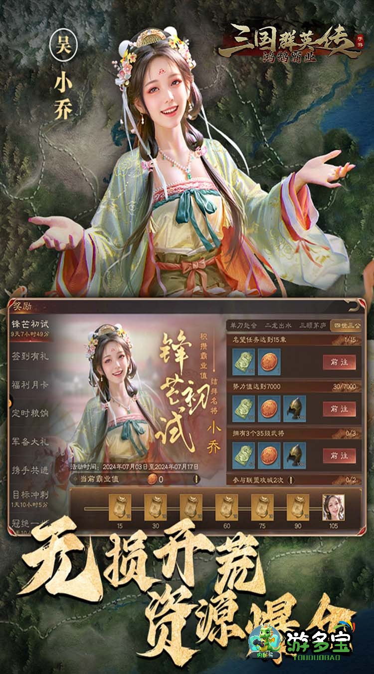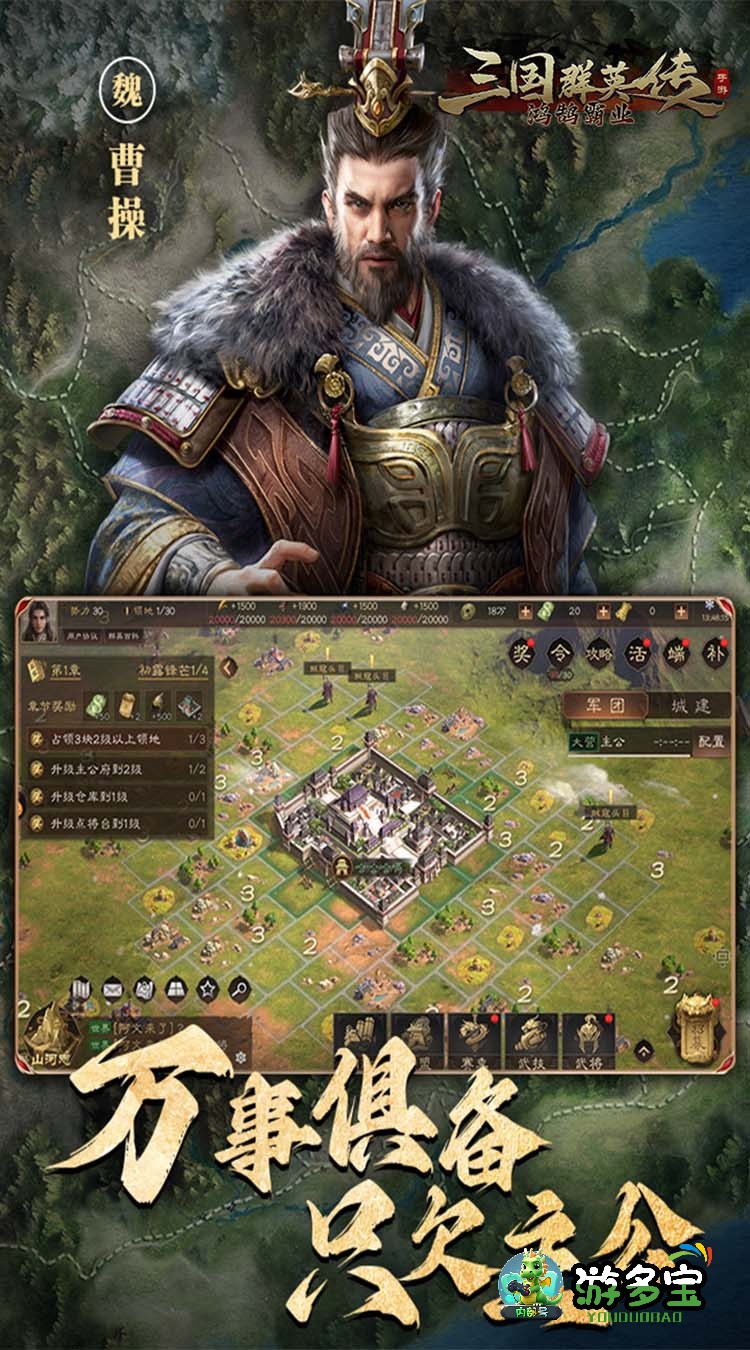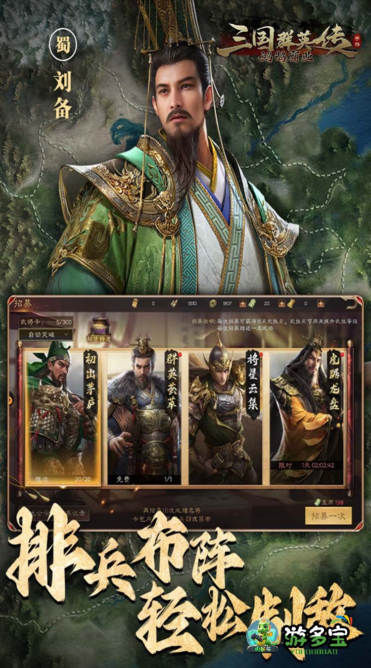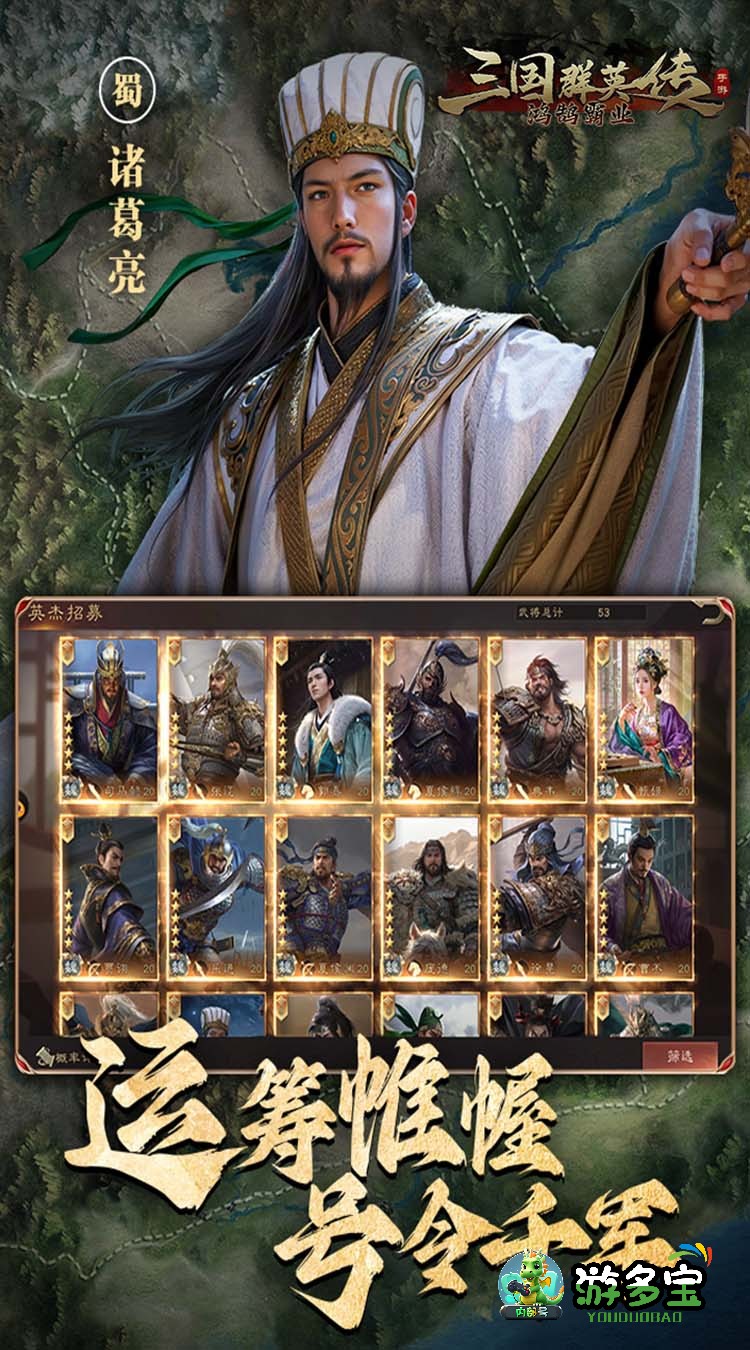 尊敬的主公们,欢迎来到《三国群英传:鸿鹄霸业》 在《三国群英传:鸿鹄霸业》中,您将以一方诸侯身份重回三国,参与角逐天下,通过与其他玩家合纵联盟占领洛阳。开局通过超高的爆率抽取和劝降获得名将,轻松获取大量资源,号令万军战场厮杀;最后剑指洛阳,夺取天下! 【爽抽橙将,玩转双沙盘】 卧龙凤雏,我全都要!三国名将任您抽,还可以运用不同的策略来劝降不同阵营的各路英雄,首周保底18橙将,五虎、桃园等经典阵容轻松配齐,平民也能轻松拥有TO队! 【五谷丰登,轻松有资源】 无损开荒,资源爆仓!资源是你征服天下的基石,车马未到,粮草先行,多种方式轻松获取足够的粮草来支撑你的雄心壮志! 【多种兵种,轻松来进阶】 兵种进阶,轻松制敌!玩家可通过兵种之间的克制以及特性的优劣,来做出多样的进阶选择,打造出历史上赫赫有名的三国特种兵,且看西凉铁骑逐鹿天下,虎豹骑大破关西! 【万人战场,轻松变大佬】 运筹帷幄,号令万军!让你体验高品质的真实三国战场,百万沙盘,万寸之间,奇诡谋士尽情施展,斩将夺旗,尽显英雄本色!